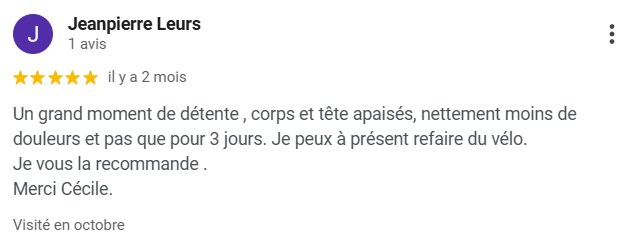 Victime d'une entorse impressionnante après une chute brutale, j'ai pu bénéficier d'une séance de magnétisme dans les 48 h : la diminution notable de la douleur et du gonflement m'ont permis de reprendre la marche quelques jours après. Je ne peux qu'inciter à vous diriger vers Cécile, attentive et respectueuse dans sa prise en charge personnalisée.